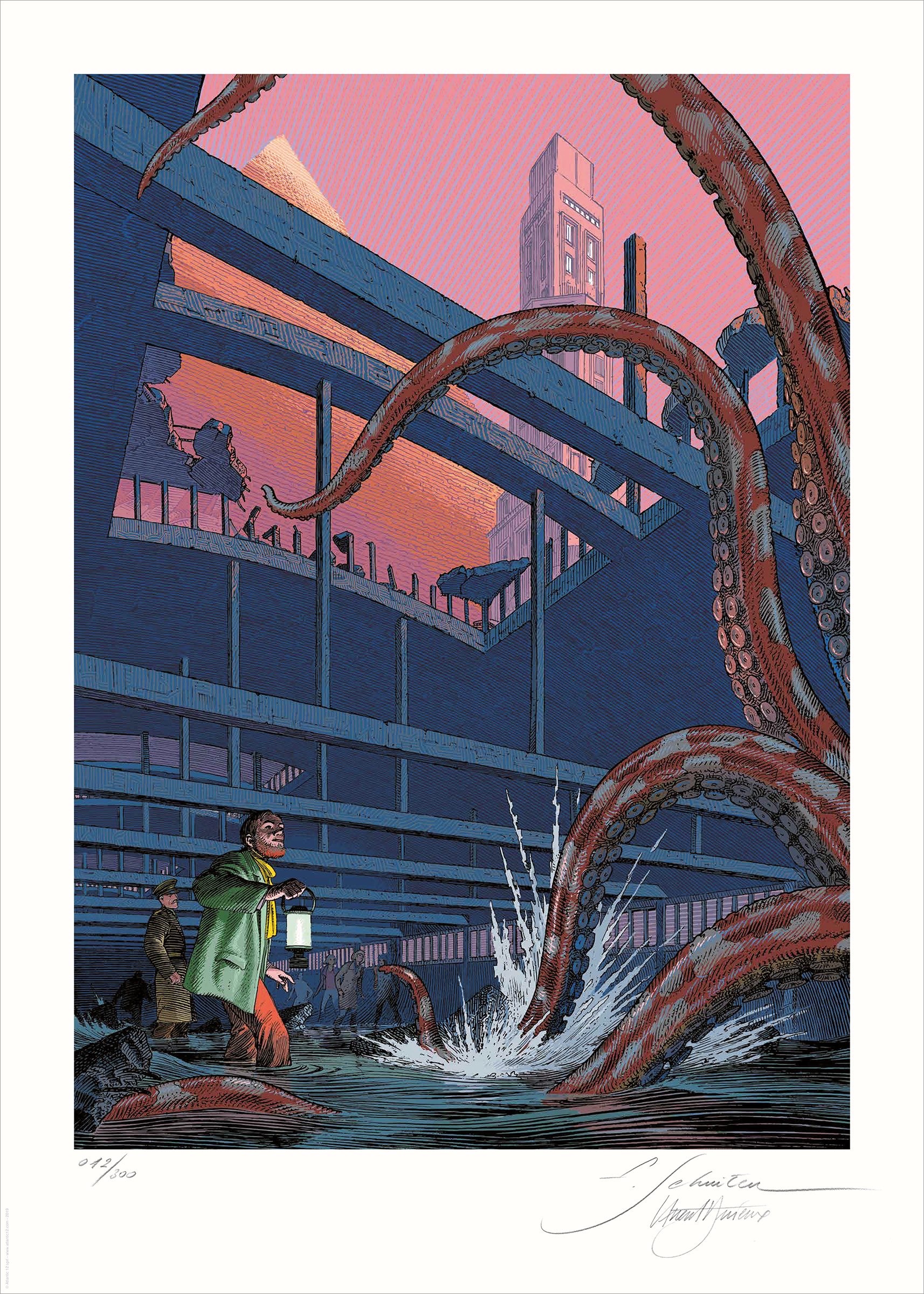 Tiré à part SCHUITEN (BLAKE ET MORTIMER), format 50*70, papier sensation 270 g, offset, numéroté et signé par l’auteur, 300 ex