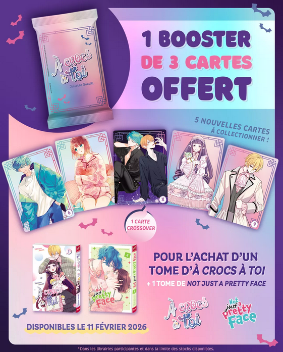 Un booster de trois cartes (5 cartes différentes) A crocs à toi offert à l'achat d'un tome de la série et d'un tome de Not just my pretty face (Hors occasion).