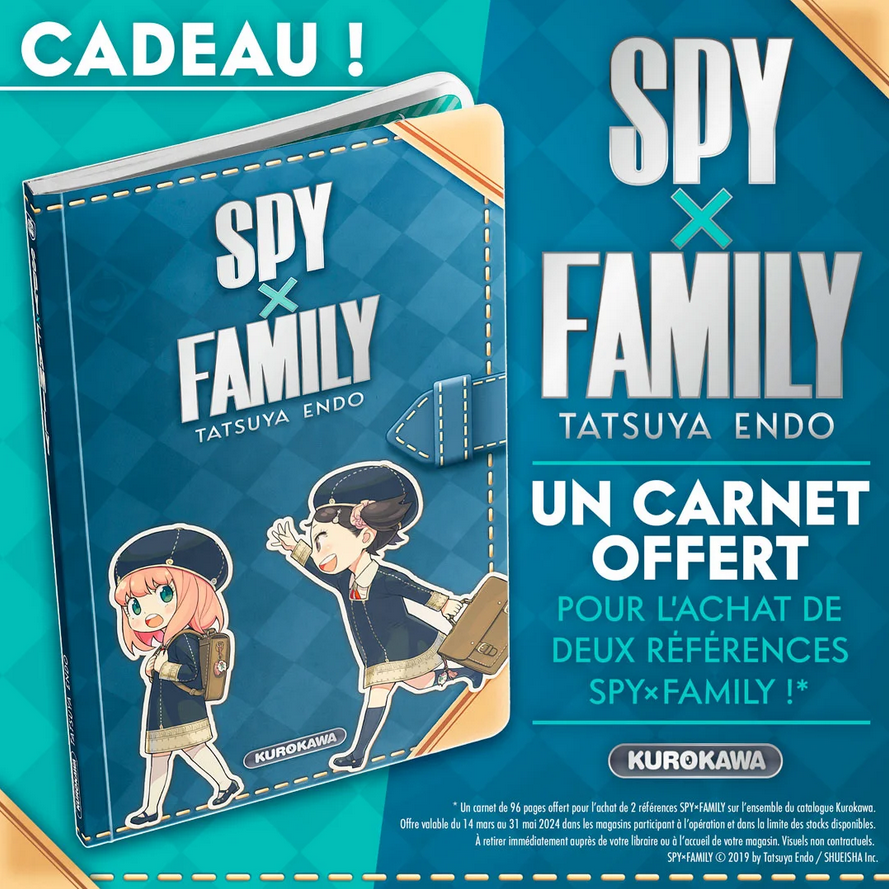 Pour l'achat de deux références "Spy x Family" chez Kurokawa (hors occasion), un carnet de liaison d'Anya est offert. Cette offre est limitée à deux exemplaires par personne (donc pour deux exemplaires = 4 mangas Spy X Family).