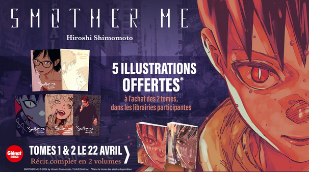 Enveloppe contenant 5 illustrations du manga "Smother Me" offerte à l'achat des 2 volumes de la série (hors occasion).