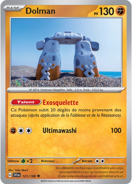 Carte UNCO du TCG Pokemon reprsentant Dolman dans l'extention ECARLATE ET VIOLET et est illustre par MORII YUKA. Carte de type COMBAT avec un niveau d'volution de BASE et portant la marque de rgulation de tournoi G.