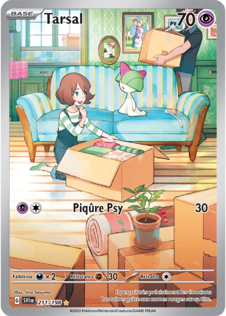 Carte SECRETE ILLUSTRATION RARE du TCG Pokemon reprsentant Tarsal dans l'extention ECARLATE ET VIOLET et est illustre par SASUMO JIRO. Carte de type PSY avec un niveau d'volution de BASE et portant la marque de rgulation de tournoi G.