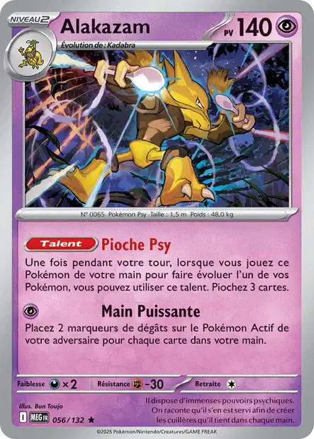 Carte HOLO du TCG Pokemon reprsentant Alakazam dans l'extention MEGA EVOLUTION et est illustre par TOUJO BUN. Carte de type PSY avec un niveau d'volution de NIVEAU 2 et portant la marque de rgulation de tournoi I.