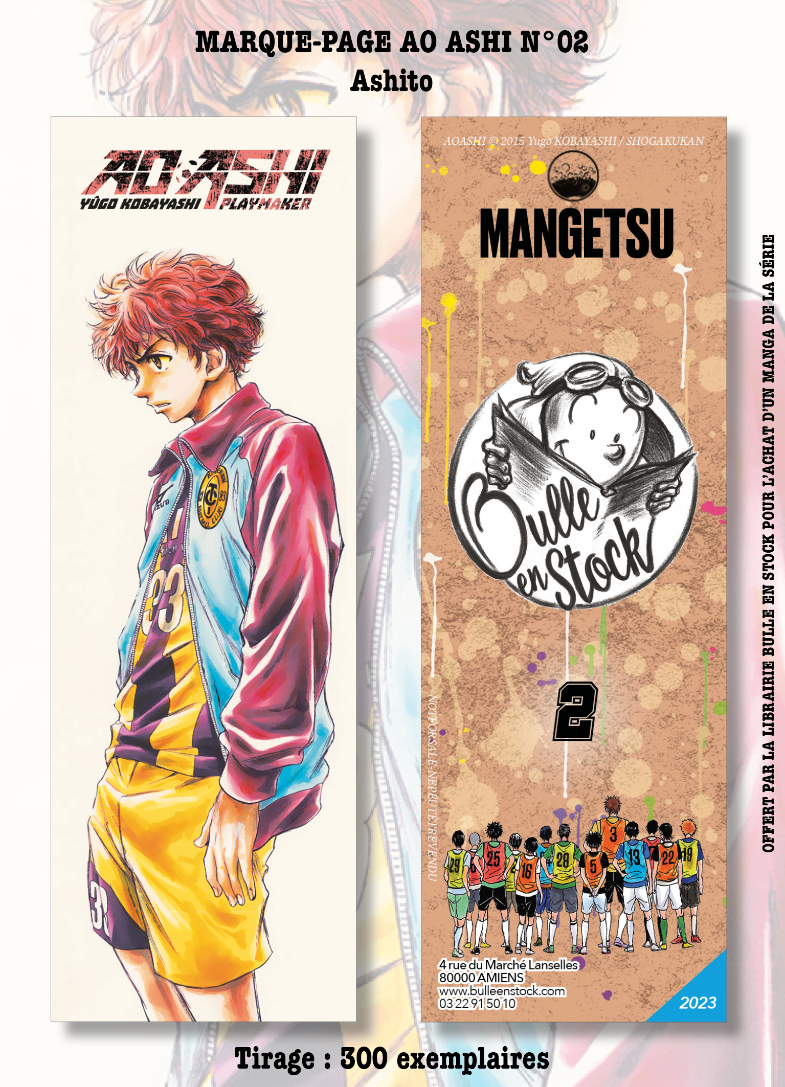Ce Marque-page est offert uniquement à l'achat d'au moins un volume de la série "AO ASHI" chez MANGETSU et sera limité à 2 exemplaires par personne quelque soit la commande (1 manga = 1 MP, 2 mangas ou plus = 2 MP). Tirage limité à 300 exemplaires. Étant une édition exclusive de la librairie BULLE EN STOCK, ce marque-page ne sera disponible que sur www.bulleenstock.com et dans la librairie ! - Imprimé sur du papier 350g, avec une finition Soft Touch, du Vernis selectif 3D, ce marque-page saura ravir les collectionneurs !