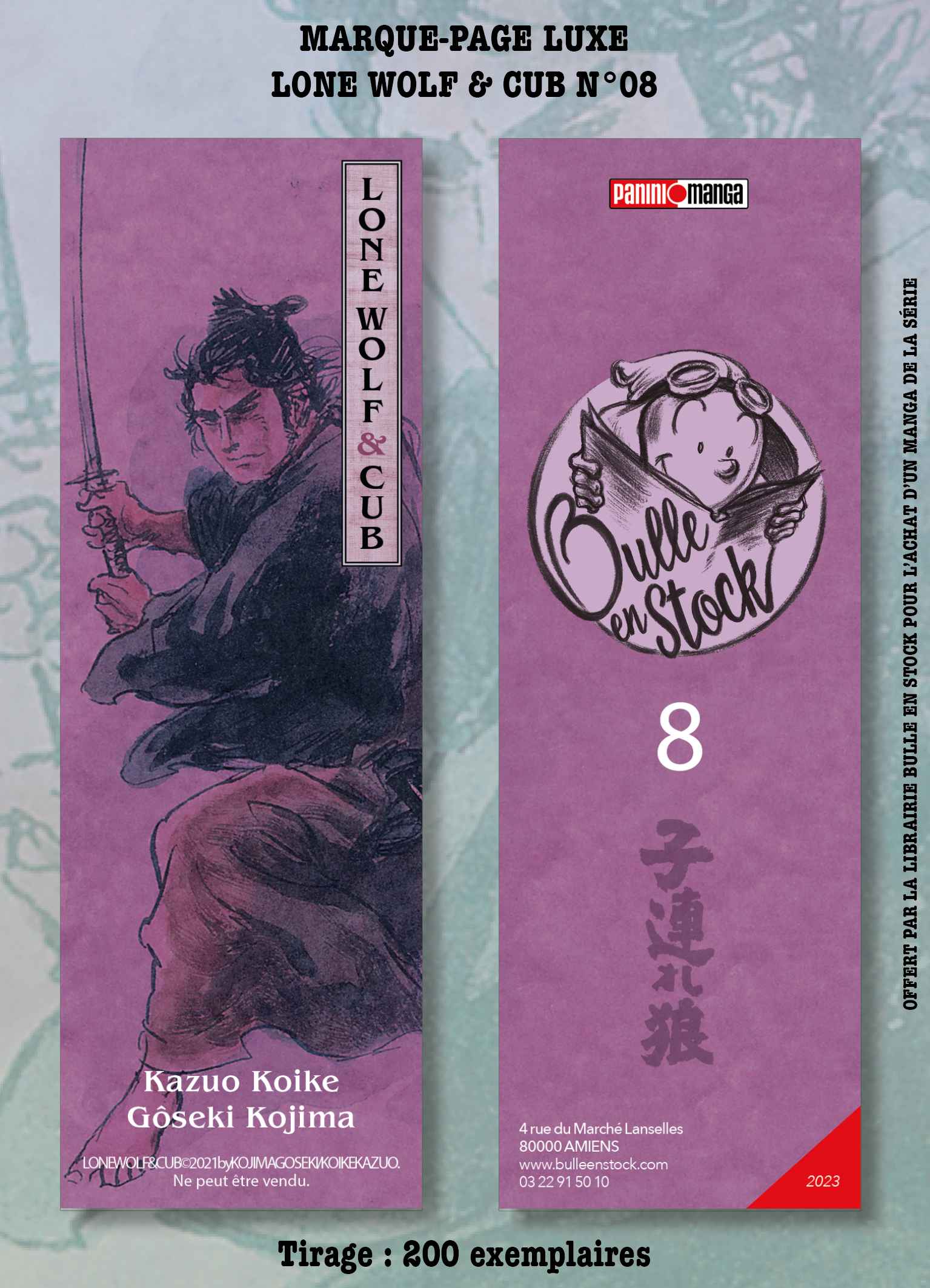 Ce Marque page est offert uniquement à l'achat d'un tome de la série "LONE WOLF & CUB" chez Panini Manga par commande, et sera limité à 2 exemplaires par personne. Tirage limité à 1000 exemplaires. Étant une édition exclusive de la librairie BULLE EN STOCK, ce marque-page ne sera disponible que sur bulleenstock.com et dans la librairie !