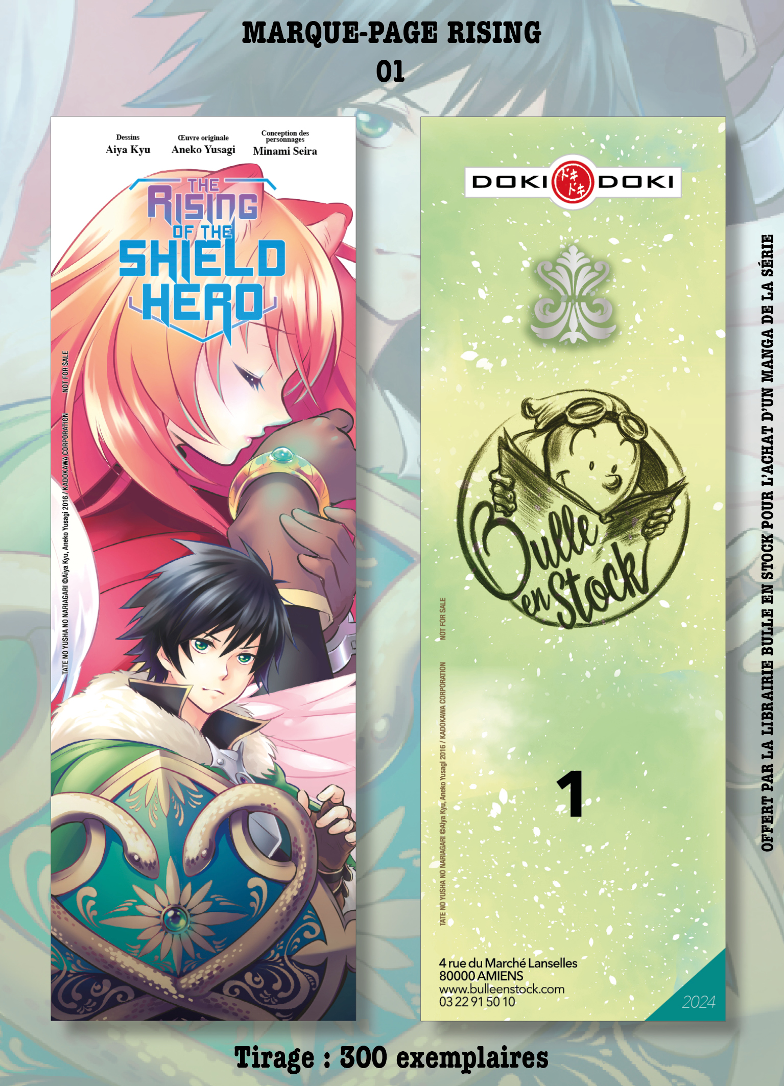 Ce Marque-page est offert uniquement à l'achat d'au moins un volume de la série "THE RISING OF THE SHIELD HERO" aux éditions DOKI DOKI (HORS PROMO ou occasion), et sera limité à 2 exemplaires (d'un meme visuel) par personne quelque soit la commande (1 manga = 1 MP, 2 mangas ou plus = 2 MP). Tirage limité à 300 exemplaires. Étant une édition exclusive de la librairie BULLE EN STOCK, ce marque-page ne sera disponible que sur www.bulleenstock.com et dans la librairie ! - Imprimé sur du papier 350g, avec une finition Soft Touch, du Vernis selectif 3D ainsi qu'un ennoblissement dorure, ce marque-page saura ravir les collectionneurs !