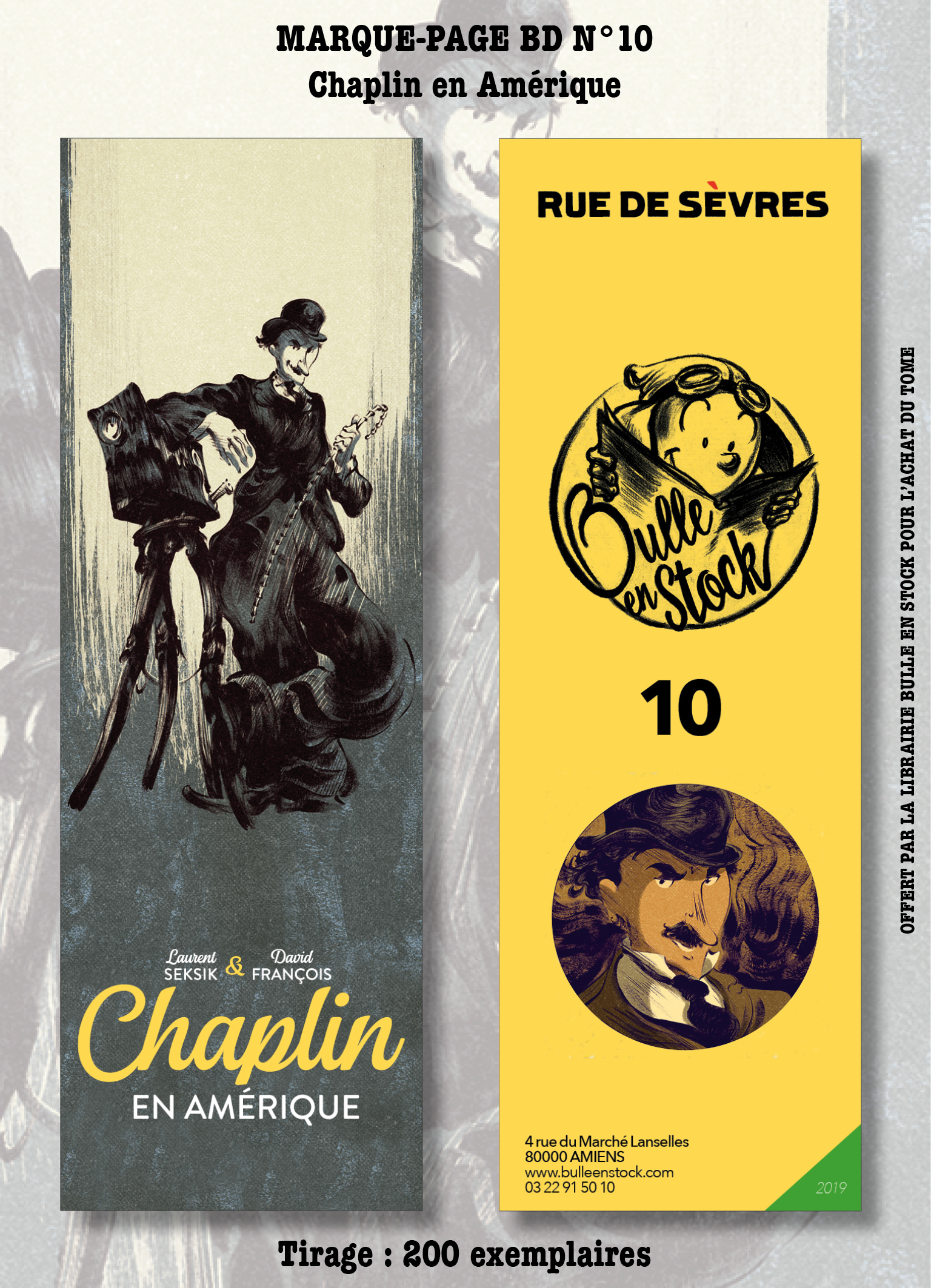 Ce Marque-page est offert uniquement à l'achat d'au moins un volume de la série "Chaplin en Amérique" aux éditions Rue de Sevres, et sera limité à 2 exemplaires par personne quelque soit la commande (1 BD = 1 MP, 2 BD ou plus = 2 MP). Tirage limité à 200 exemplaires. Étant une édition exclusive de la librairie BULLE EN STOCK, ce marque-page ne sera disponible que sur www.bulleenstock.com et dans la librairie ! - Imprimé sur du papier 350g, avec une finition Soft Touch, du Vernis selectif 3D, ce marque-page saura ravir les collectionneurs !