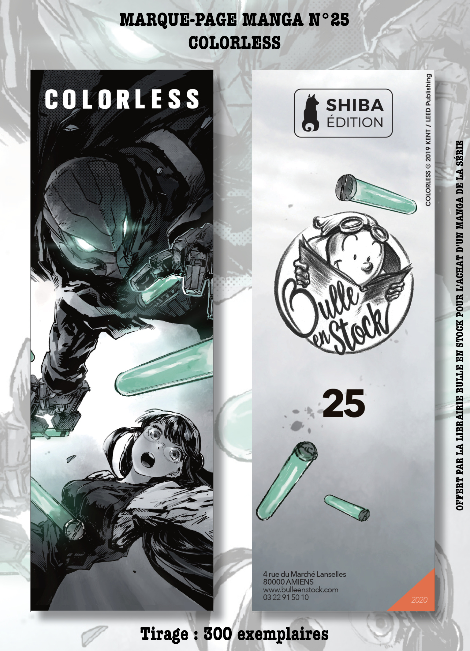 Ce Marque page est offert uniquement à l'achat d'un tome de la série "COLORLESS" chez SHIBA EDITION par commande, et sera limité à 2 exemplaires par personne. Tirage limité à 300 exemplaires. Étant une édition exclusive de la librairie BULLE EN STOCK, ce marque-page ne sera disponible que sur bulleenstock.com et dans la librairie !