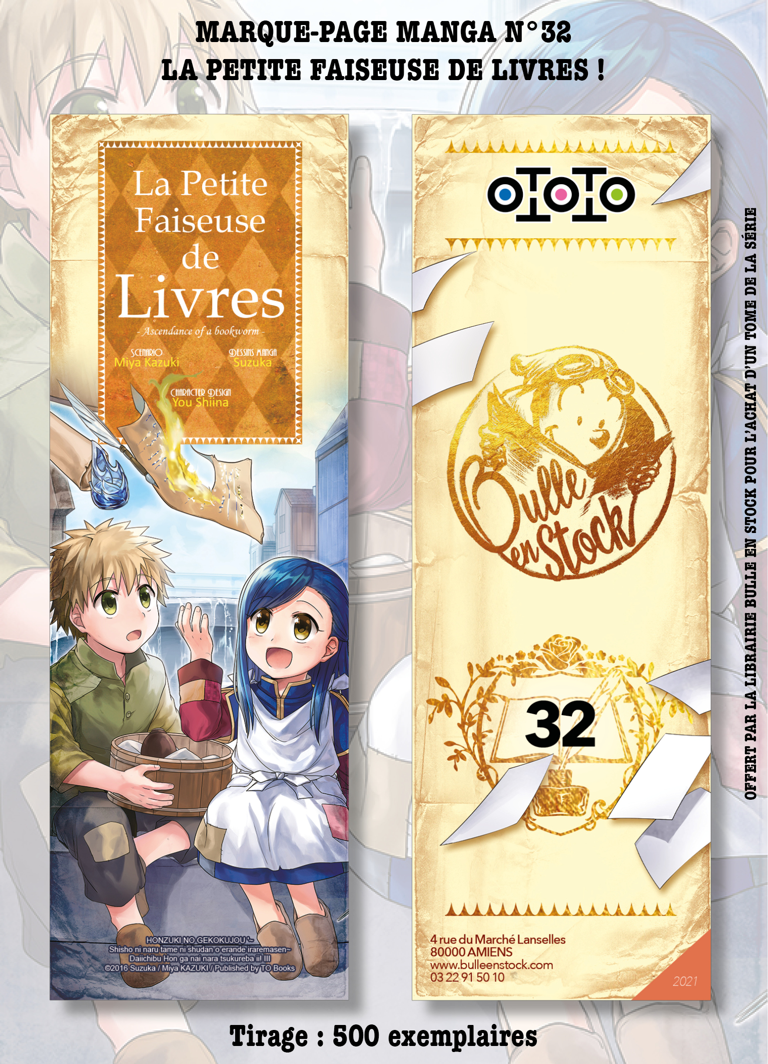 Ce Marque-page est offert uniquement à l'achat d'au moins un volume de la série "La petite faiseuse de Livres" aux éditions Ototo (hors occasion), et sera limité à 2 exemplaires par personne quelle que soit la commande (1 manga = 1 MP, 2 mangas ou plus = 2 MP). Tirage limité à 500 exemplaires. Étant une édition exclusive de la librairie BULLE EN STOCK, ce marque-page ne sera disponible que sur www.bulleenstock.com et dans la librairie ! - Imprimé sur du papier 350g, avec une finition Soft Touch, du Vernis selectif 3D, ce marque-page saura ravir les collectionneurs !