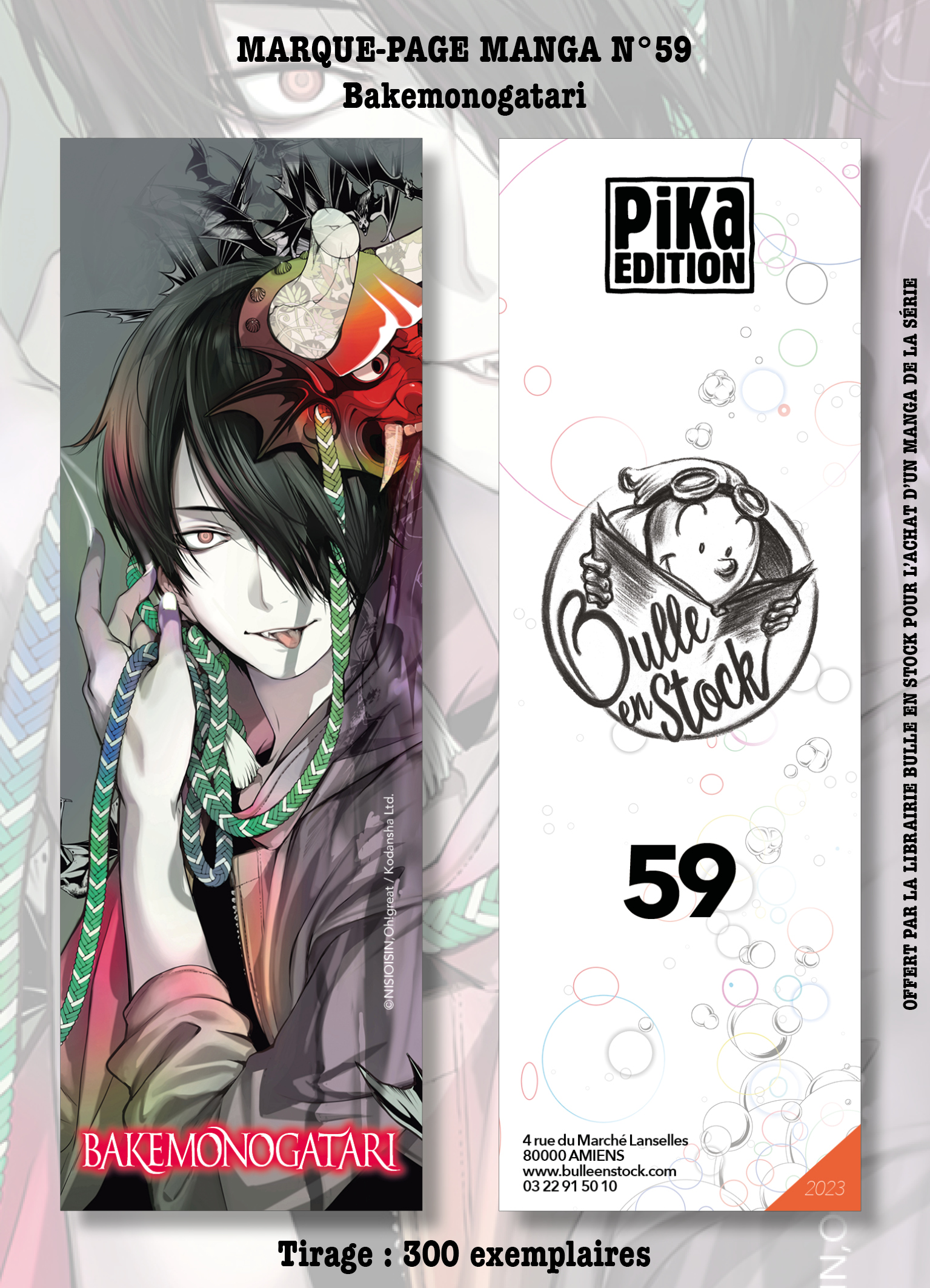 Ce Marque-page est offert uniquement à l'achat d'au moins un volume de la série "BAKEMONOGATARI" chez Pika et sera limité à 2 exemplaires par personne quelque soit la commande (1 manga = 1 MP, 2 mangas ou plus = 2 MP). Tirage limité à 300 exemplaires. Étant une édition exclusive de la librairie BULLE EN STOCK, ce marque-page ne sera disponible que sur www.bulleenstock.com et dans la librairie ! - Imprimé sur du papier 350g, avec une finition Soft Touch, du Vernis selectif 3D, ce marque-page saura ravir les collectionneurs !