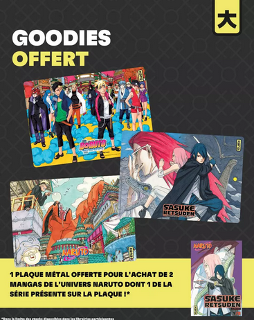 Offert à l'achat de deux tomes de l'univers Naruto dont un tome de Boruto (hors occasion et non cumulable avec l'autre plaque métallique).